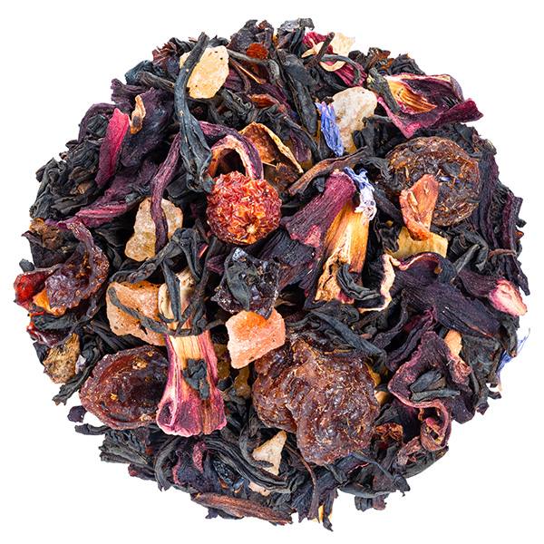 Ingredients: Black tea, strawberry, raspberry, hibiscus, grapes, rosehip, pineapple, papaya pieces, lemon peel, mango, cornflowers, natural flavour.