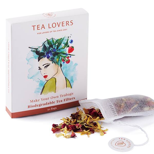 Specs: Made from plant-based PLA corn fibre, each box contains 50 biodegradable tea bags (6×8 cm), presented in a Tea Lovers gift box.