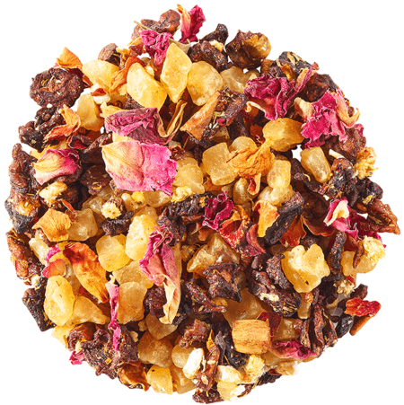Ingredients: Freeze-dried lemon juice granules, freeze-dried rhubarb pieces, pineapple cubes (pineapple, sugar), apple pieces (apple, citric acid), beetroot, lemon oil, rose petals, natural flavour.