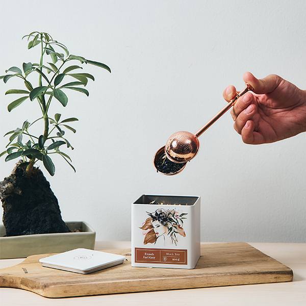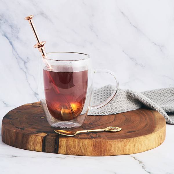 A sleek rose gold tea wand for effortless single-serve brewing. Press the handle to open the tea ball, add 1–2 teaspoons of loose leaf tea, then swirl and steep. Also great for light cold brew infusions.