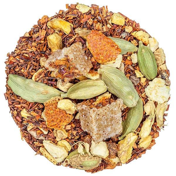 Ingredients: Rooibos, ginger candy sticks, cardamom, orange peels, natural flavour.