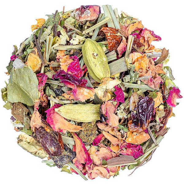 Ingredients: Grapes, balm-mint leaves (lemon balm), fennel, lemongrass, cardamom, chamomile, peppermint, sage, jasmine rose flowers, nutmeg.