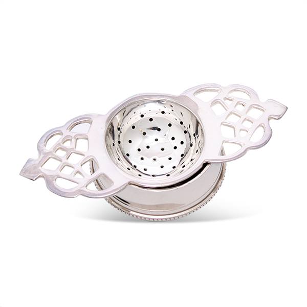 Tea Strainer Floral Nickle-Plated. 2 Pieces – strainer and drip bowl. Approx. 3.9 x 14.1 cm.